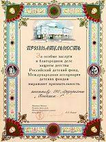 Грамота Российского детского фонда «Признательность», учреждена для награждения руководителей местных отделений РДФ, общественных активистов, граждан, которые внесли большой вклад в решение проблем детства.